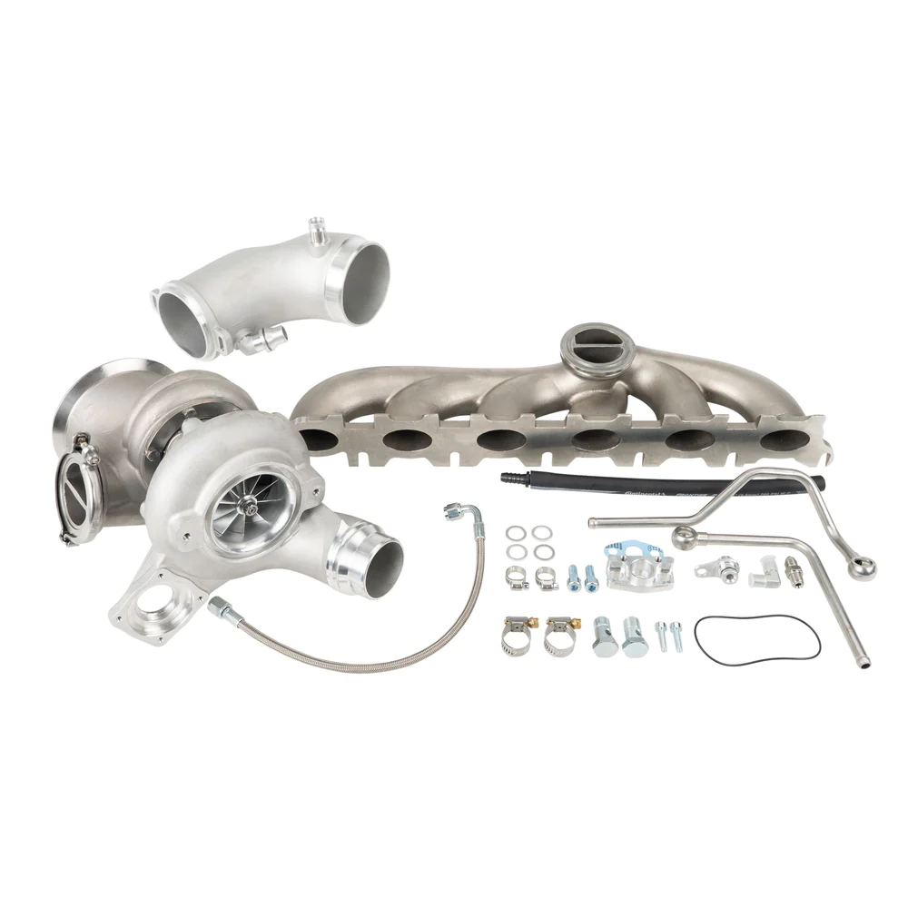 The kit features a complete brand new turbocharger, with no need for a core to be sent in or purchased. It includes a GTX3582R-style Gen2 ceramic ball-bearing CHRA (dual ball-bearing), billet 11 blade compressor wheel, proprietary stainless steel turbine housing, flow matched to the turbocharger, VSR balanced to exceed OE tolerances, 4-inch turbo inlet, oil and water fittings, and is compatible with factory installation hardware (not included) and factory wastegate actuator (not included, use your original wastegate actuator).