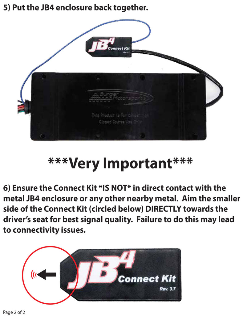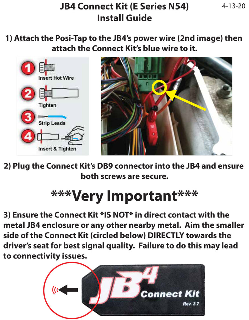nThe JB4 Connect Kit (Rev 3.7) allows your Bluetooth 4.0 compatible iOS and Android devices to connect wirelessly to your JB4. View critical engine data in real-time, datalog, read codes, change maps, update settings, update firmware, and more, all from the palm of your hand! The REV3 mounts next to the JB4 in the engine bay eliminating the need to run a BMS DATA cable inside the cabin. It’s compatible with all JB4 products. Just plug it in to the JB4 where your BMS DATA cable connects, attach the power and ground wire to the JB4 harness using the included connectors, purchase the JB4 Mobile app, and you’re off and running. Please note the JB4 Mobile app is available for iPhone®, iOS, or Android® and sold separately via the Apple® or Android® app store on your phone. This adapter is not compatible with the JB4 windows interface.