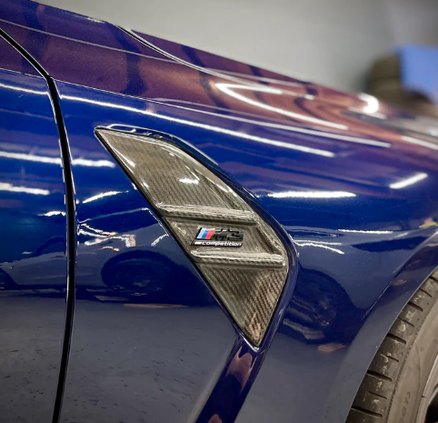 Replace the G80 M3 G82 M4 stock black plastic side fender air breather trims with these high quality carbon fiber pieces made of pre-preg dry carbon for perfect fitment and finish. Simply remove your OEM pieces and pop these in!