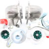Stage 2 Hybrid upgrade: A complete brand new hybrid from Compressor to Turbine using all new OEM spec internals. We take a brand new custom cast VTT compressor housing, bearing housing, and turbine housing manufactured to accept a custom compressor Wheel and our proprietary Custom 9 blade TD04L turbine wheel with a full Garrett profile for full flow to redline. We were the FIRST to design, and use a Garret profile 9 blade TD04L turbine for the N54. Now everyone has copied it and uses them in some of their offerings. We then replace the factory wastegate arm and flapper valve with the 100% stainless steel version and include brand new OEM actuators.
