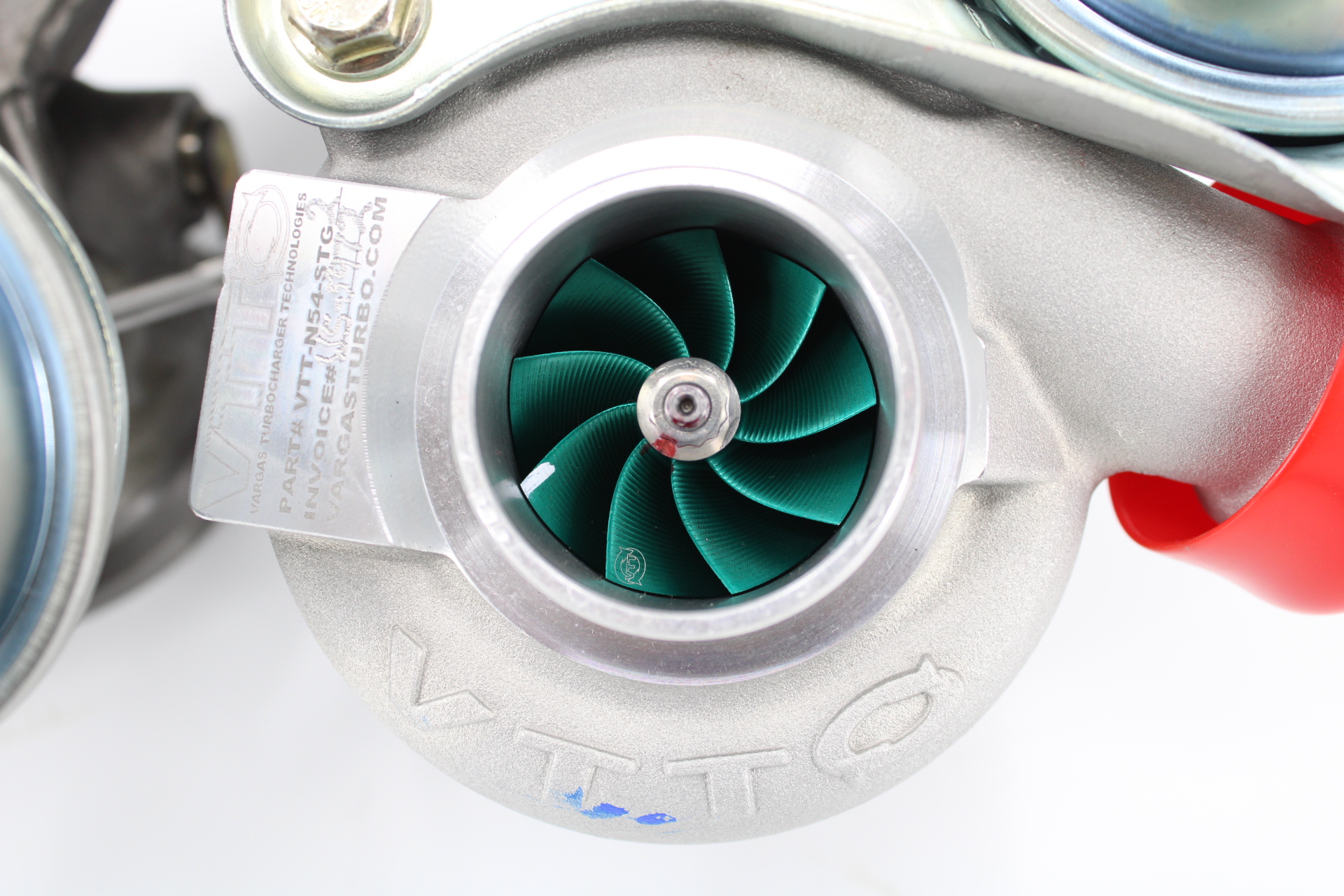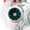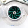 VTT Billet compressor wheel option: Every set of VTT Stage 2 upgrades comes with the amazing VTT Billet Compressor wheel option. These are fully forged billet wheels, utilizing an ultra-efficient 9 blade wheel design as well as “extended tip technology” to increase airflow a solid 20% over the cast 15T wheels. This also helps the turbos work less hard to make the same power, as shown by our Shaft speed testing. All Stage 2 turbo comes with Green Anodized wheels