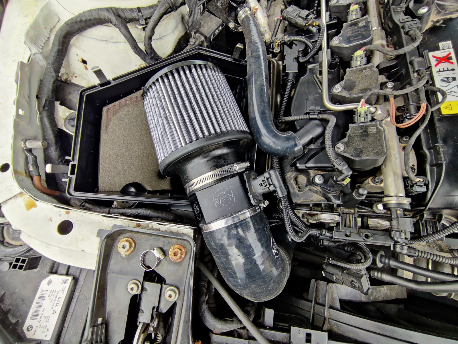 VTT is proud to announce another product in our carbon fiber product line. The BMW F-Series B58 Modular Carbon fiber intakes system! We COMPLETELY do away with the entire factory intake tract, including the accordion hose, the turbo muffler, all of the restrictive bends. We then replaced it with a smooth radius 2.5″-4″ Silicone intake pipe with wire impregnated to ensure strength and longevity. This is coupled with our billet intake connection for an OEM-like fit, and finish. We then created a 100% carbon factory-style intake top and coupled it with our high-flow cotton pre-oiled filters. These tops are 8 layers of 100% carbon, not a single layer wrapped over plastic and they are 1.3MM thick with our logo vacuum printed onto the tops, with a UV resistant gloss clear coating. This is not only strong but will resist discoloration for an extended period of time. The filters themselves are made with a heat-resistant silicone base, a high-flowing cotton weave element with a pre-oiled design to catch contaminates but allow free flow. But we didn’t stop there! For the crowd looking for increased intake sound, we also made this compatible with our 4″ Cone filter for increased flow, and much louder intake sound!