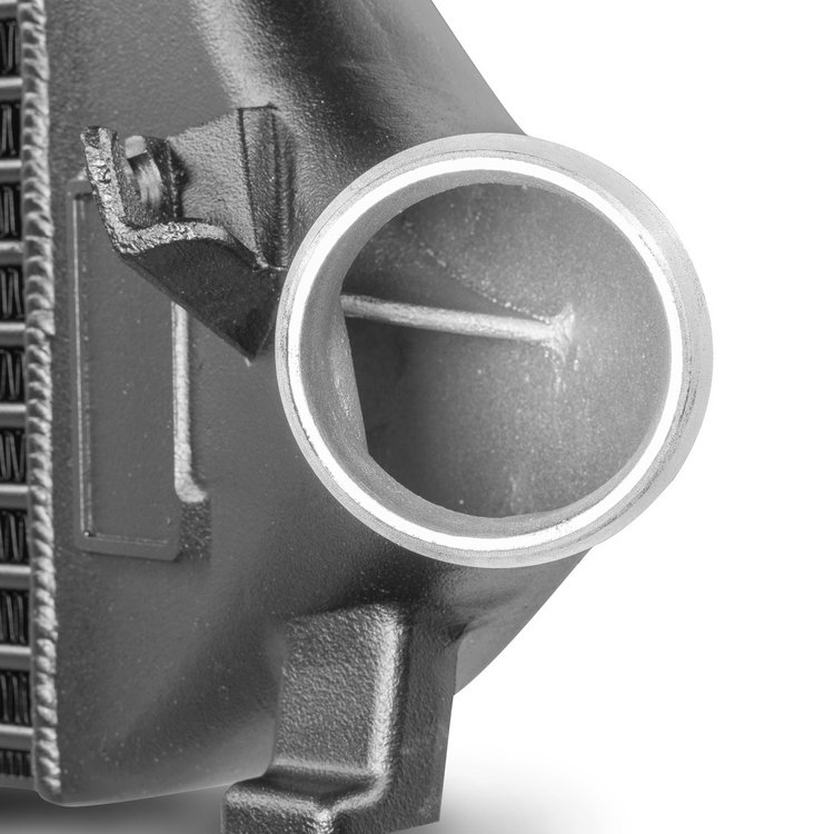 The cast aluminum end boxes were precisely designed in CAD and optimized using CFD simulations to ensure ideal internal airflow. Specially integrated air routing in the radiator inlet ensures uniform filling of the intercooler network and maximum cooling characteristics with minimal backpressure. The newly developed Competition high-performance mesh also ensures sufficient airflow to adjacent components such as the water cooler and is particularly lightweight despite its performance. This kit is perfectly suited for racing and allows for optimal cooling of the supercharged air.